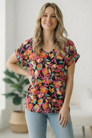 A rich black ground sets the stage for a blooming floral woven print that feels fresh and polished at once. The relaxed yet structured silhouette skims the body in a lightweight woven fabric that drapes beautifully and photographs well. This is the kind of top your customers pick up without hesitation.