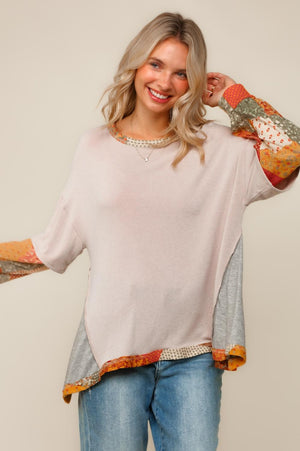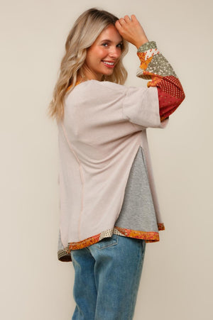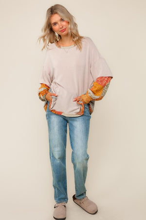BOHEMIAN ETHNIC PATCHWORK PRINT THERMAL COLOR BLOCK ROUND NECK TWOFER LONG SLEEVE PULLOVER OVERSIZED WASHED FRENCH TERRY KNIT TOP WITH OUT SEAM OVERLOCK REVERSE STITCHES