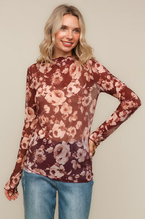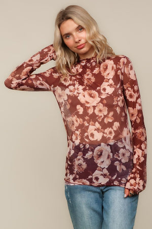 HIGH NECK LINE LONG SLEEVE FLORAL PRINT MESH SEMI SHEER TOP WITH FRILLED MERROW HEM