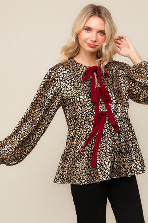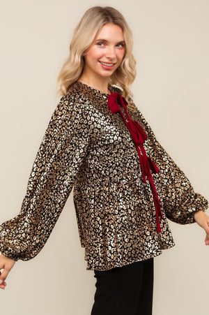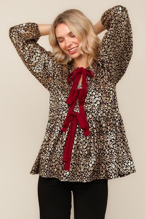 SOLID FRONT RIBBON BOW TIE ROUND NECK BABYDOLL PUFF BUBBLE LONG SLEEVE LEOPARD ANIMAL FOIL PRINT COLOR BLOCK BLOUSE TOP