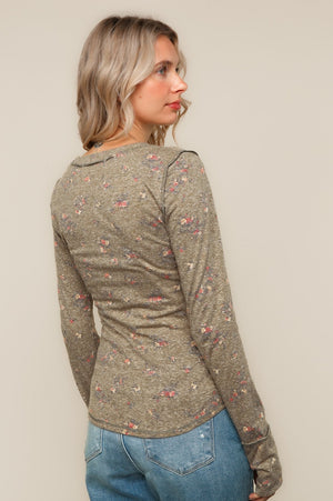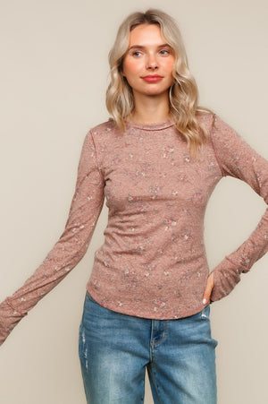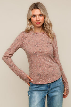 ROUND NECK BANDED LONG SLEEVE WITH THUMB HOLE FLORAL PRINT COTTON BLEND TRI BLEND KNIT TOP