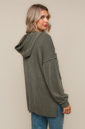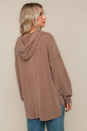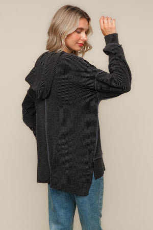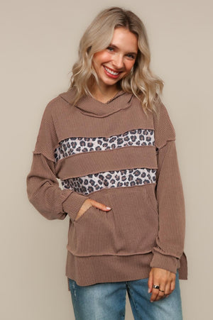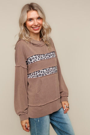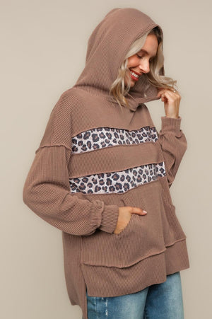 WIDE NECK OVERLAPPED LONG SLEEVE OVERSIZE LOOSE FIT TWO TONE WAVE RIB LEOPARD PRINT KNIT COLOR BLOCK HOODIE PULLOVER WITH SIDE SLITS AND KANGAROO POCKET