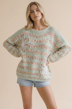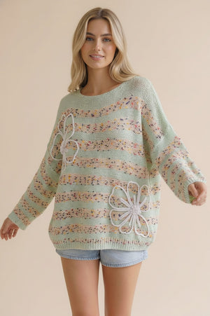 Turn heads this season with our Mint Popcorn Stripe 3D Flower Long Sleeve Sweater, featuring charming popcorn-textured stripes and delicate dimensional floral accents for a look that's anything but ordinary. The stretchy polyester-spandex blend ensures a comfortable, flattering fit perfect for layering or wearing on its own. A must-have statement piece that effortlessly elevates your boutique.