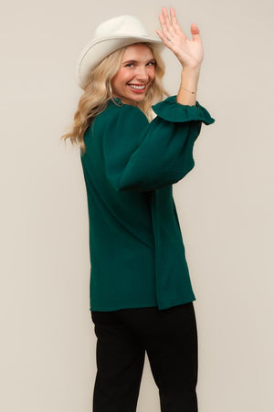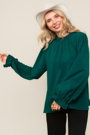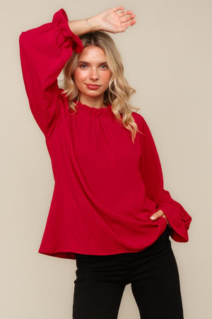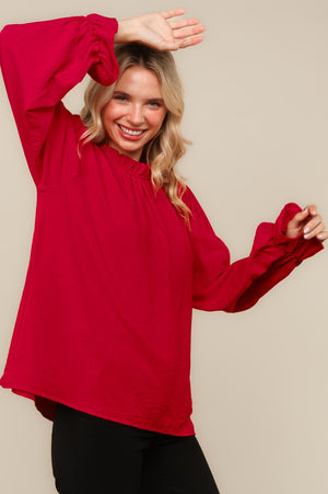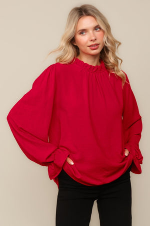 FRILLED MOCK NECK WITH BUTTON BUBBLE LONG SLEEVE WITH RUFFLE HEM SOLID CRINKLE WOVEN BLOUSE TOP