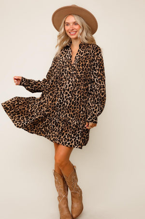COLLARED NOTCH NECK BABYDOLL LONG SLEEVE LEOPARD ANIMAL PRINT KNEE LENGTH WOVEN DRESS