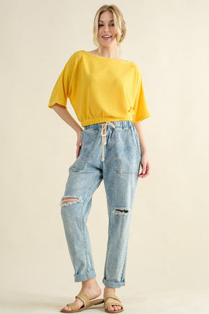 This sunshine yellow jacquard banded top brings texture and color together in a silhouette that feels polished and fresh. The structured banding adds a tailored touch to a relaxed fit, making it a piece that reads as put together without feeling overdone. Plus size customers will love how the fabric holds its shape while still feeling comfortable throughout the day.